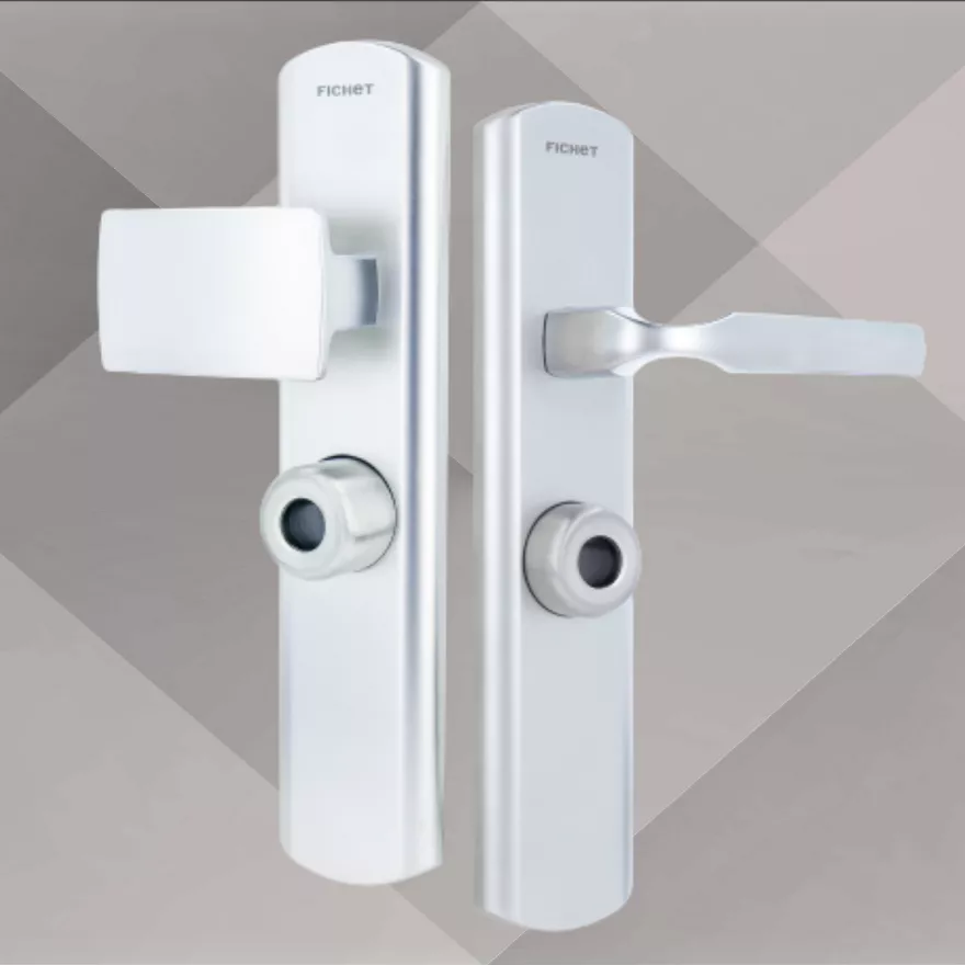 Les équipements de porte Artis incluent béquille sur plaque, aileron sur plaque, béquille sur rosace, aileron sur rosace extérieur, protecteur de cylindre avec rosace extérieur, et pommeau central extérieur pour portes palières et pavillonnaires équipées de cylindre rond Fichet.